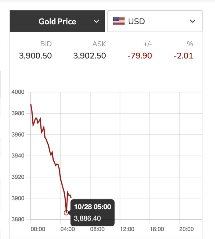 Trong phiên, có lúc giá vàng rơi tự do, chỉ còn 3.886 USD/ounce, giảm 120 USD/ounce so với phiên sáng. Tới 17 giờ, theo giờ Việt Nam, giá kim loại quý trên sàn quốc tế được giao dịch ở mức 3.903 USD/ounce.