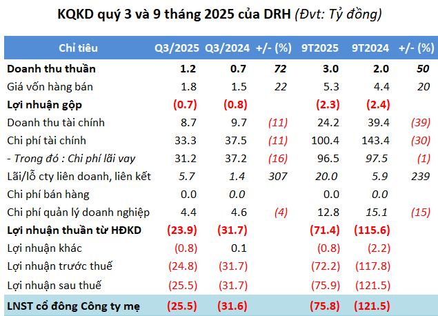 Quý 3, DRH Holdings vẫn tiếp tục chìm trong thua lỗ với gần 26 tỷ đồng, nâng tổng chuỗi thua lỗ lên 10 quý liên tiếp, lỗ lũy kế gần 157 tỷ đồng.
