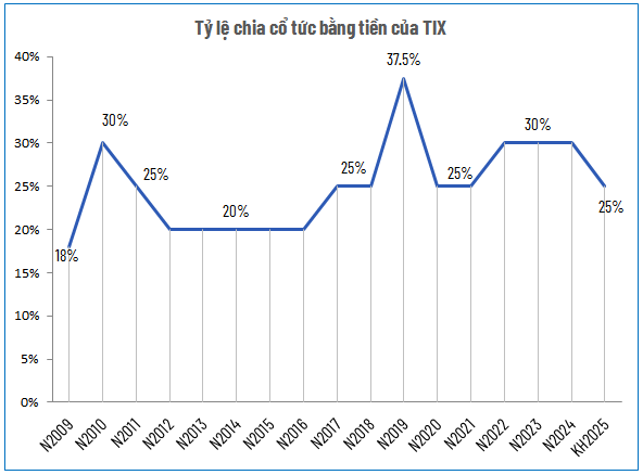 TIX là doanh nghiệp có lịch sử chia cổ tức đều đặn suốt 17 năm liên tiếp. Năm 2019, tỷ lệ cổ tức đạt mức cao nhất là 37.5%. Trong giai đoạn 2022-2024, Công ty duy trì tỷ lệ 30%, trước khi điều chỉnh nhẹ còn 25% cho năm 2025 do kế hoạch doanh thu và lợi nhuận sau thuế giảm nhẹ lần lượt 4% và 7%, xuống khoảng 256 tỷ đồng và 98 tỷ đồng.