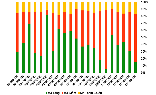 Kết thúc phiên giao dịch ngày 27/10/2025, toàn thị trường có 38 mã tăng, 172 mã giảm và 43 mã tham chiếu.